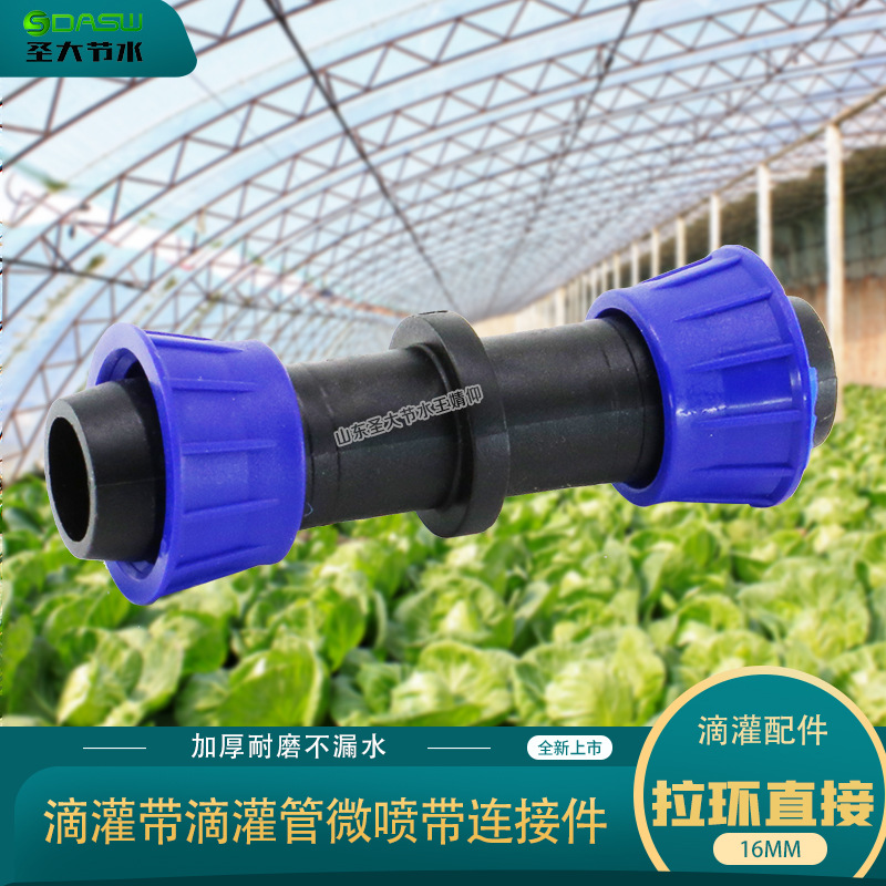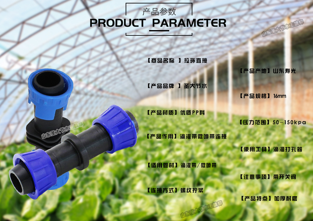 山东圣大节水生产的滴灌拉环直通购,规格有16mm,螺纹连接,安装方便,滴水均匀,不堵塞。